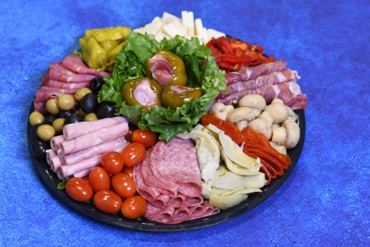 <p>A delicious assortment of the Mediterranean - with tabouli, hummus, tzatziki, stuffed grape leaves, feta, pepperoncini, peppadews, olives & naan bread.<br>